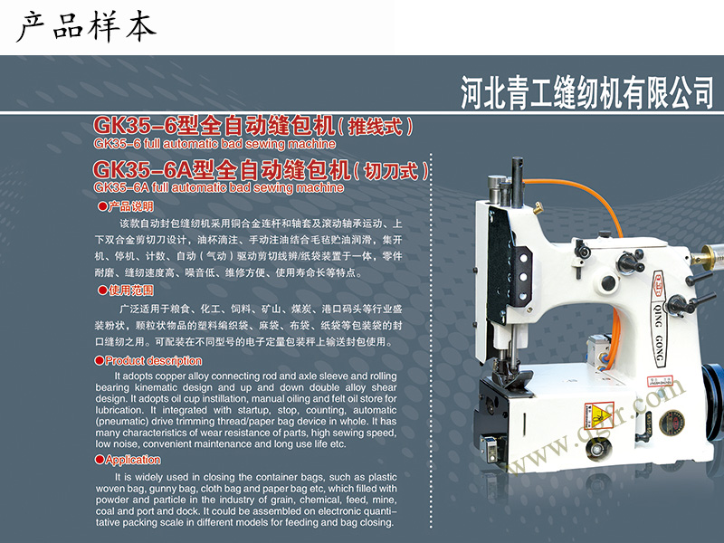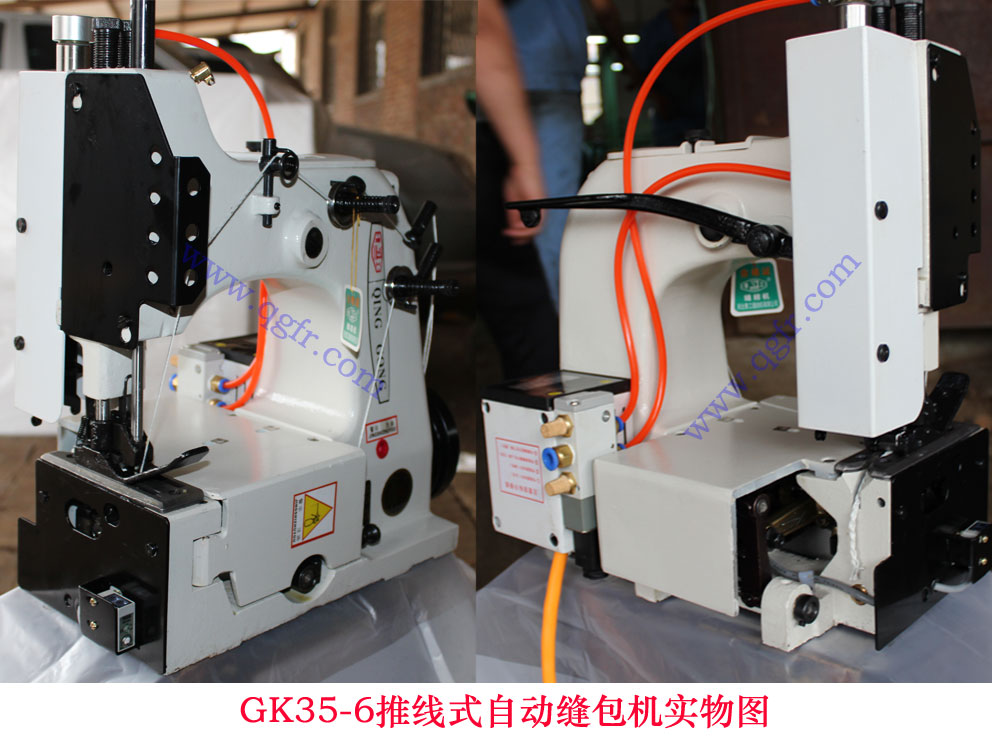 c.GK35-6AF型反方向自動(dòng)縫包機,在GK35-6A自動(dòng)縫包機基礎上開(kāi)發(fā)的一種新型反方向縫包機。該機可以與GK35-6A型正機相配合,在同一立柱上在兩側同時(shí)縫合袋口。