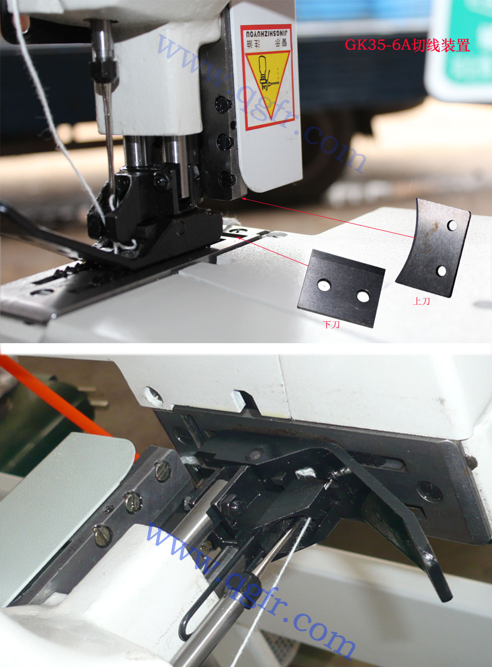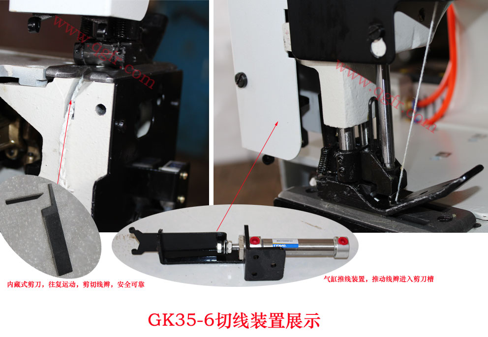 b.GK35-6A型全自動(dòng)縫包機,采用切刀式結構,在氣缸推動(dòng)下,上刀與下刀配合完成切線(xiàn)動(dòng)作,切線(xiàn)更加可靠,而且能夠同時(shí)切斷皺紋紙等。