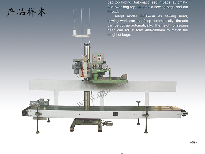 縫包機采用GK35-6系列或GK68-9全自動(dòng)縫包機,光電控制自動(dòng)啟動(dòng)和停止縫合,自動(dòng)剪切線(xiàn)辨??p包機在支撐立柱上的位置可以在400-900mm范圍內自由調整,充分滿(mǎn)足不同高度包裝袋的縫合要求。